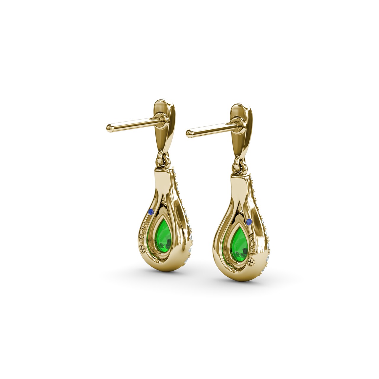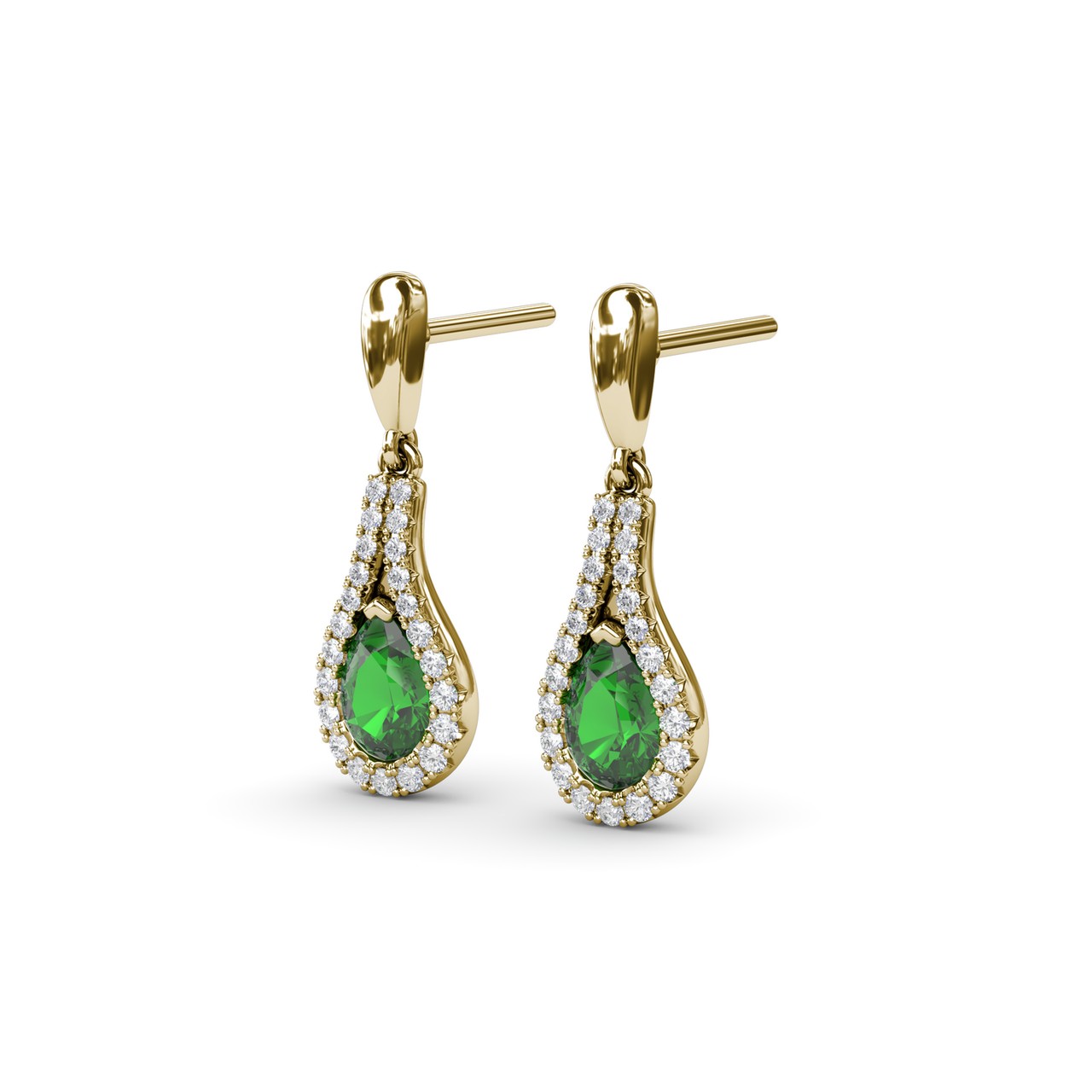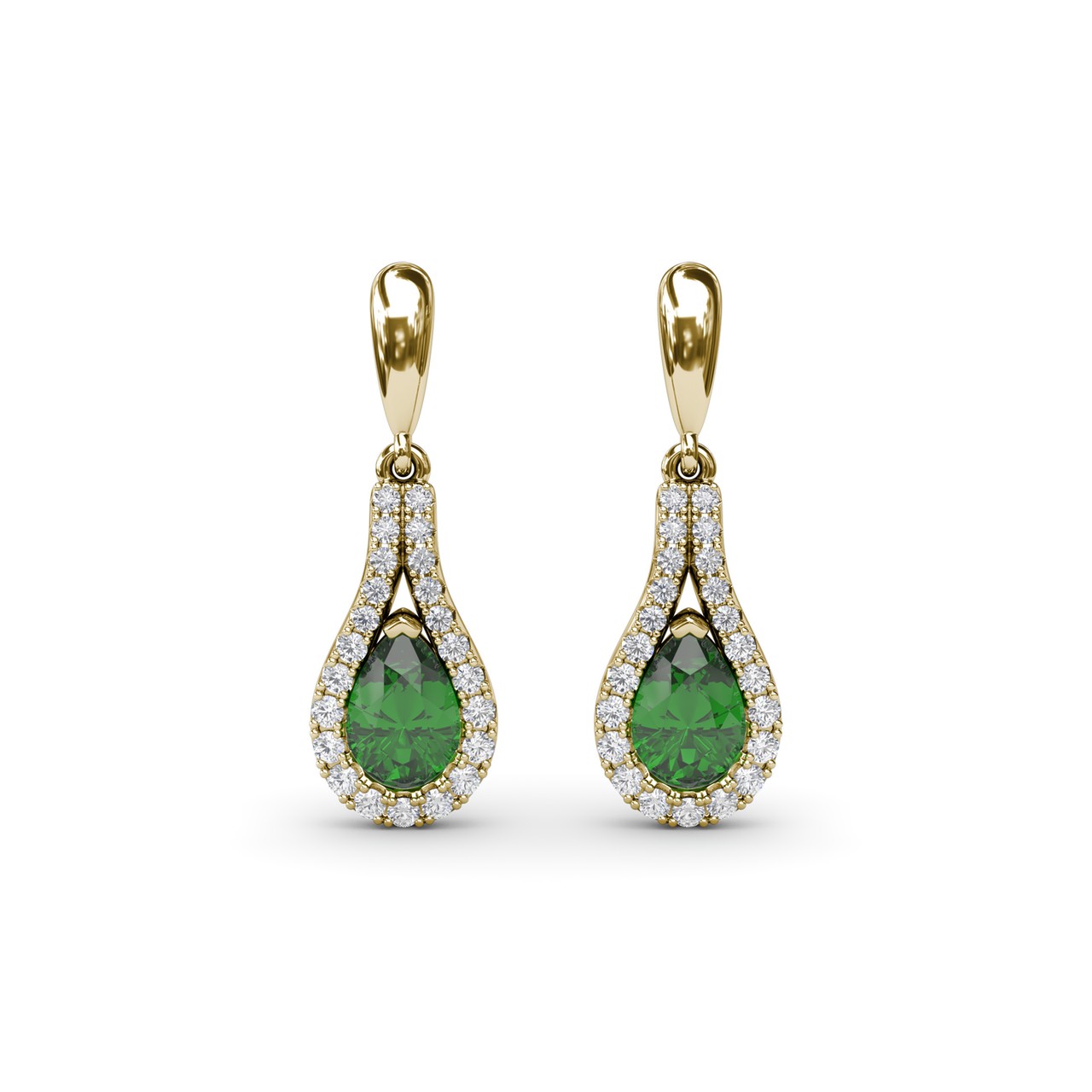 Elevate any ensemble with the enchanting allure of these exquisite emerald earrings. Encircling these pear-shaped emeralds is a dazzling embrace of brilliant-cut diamonds, forming a delicate wrap that exudes elegance and sophistication. Fana gemstone earrings are perfect for that special woman in your life.