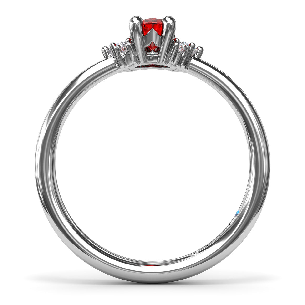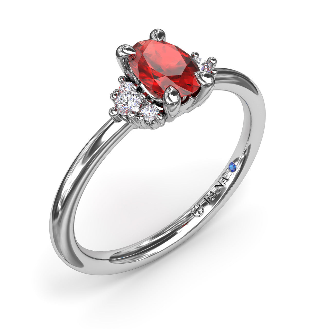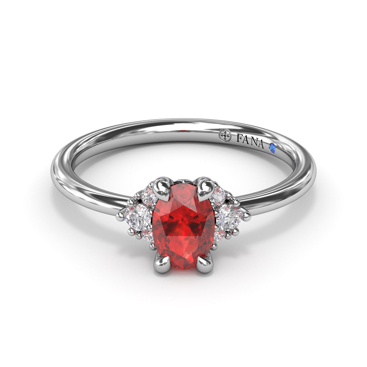 This ring features an oval ruby encrusted by three diamond side clusters giving you that extra sparkle you deserve. This ring comes in a variety of material types like 14k white gold, yellow gold, rose gold and can be customized. Classic Fana rings are perfect for that special woman in your life.