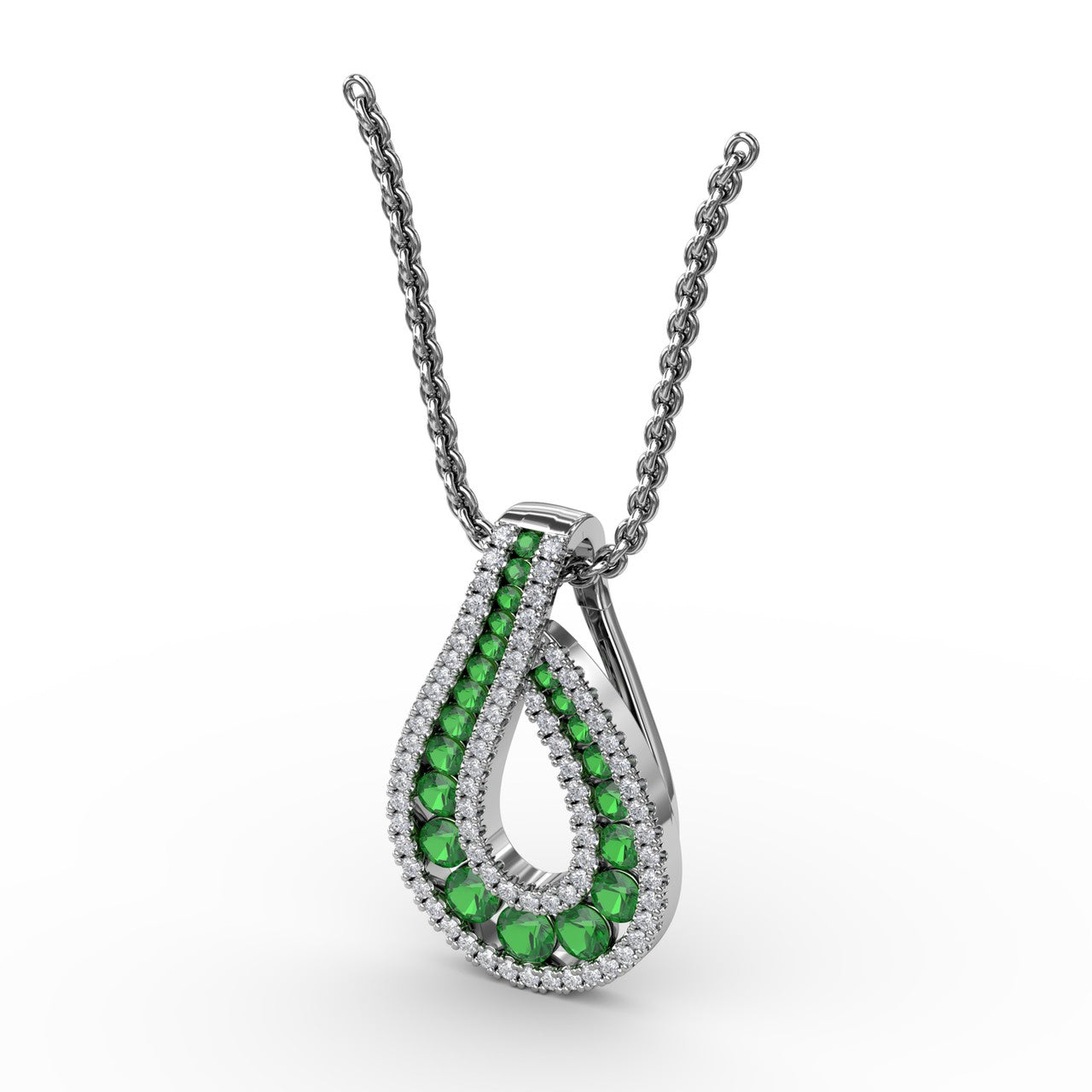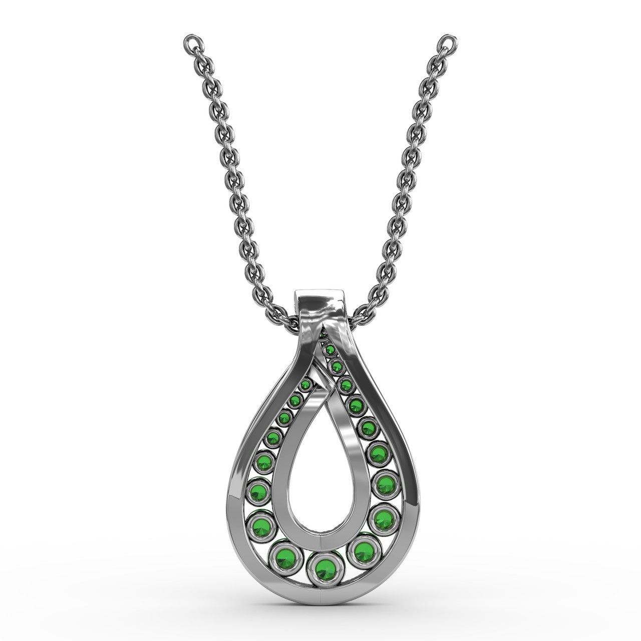This infinity loop emerald pendant comes in a variety of material types like 14k white gold, yellow gold, rose gold and can be customized. Fana gemstone pendants are perfect for that special woman in your life.