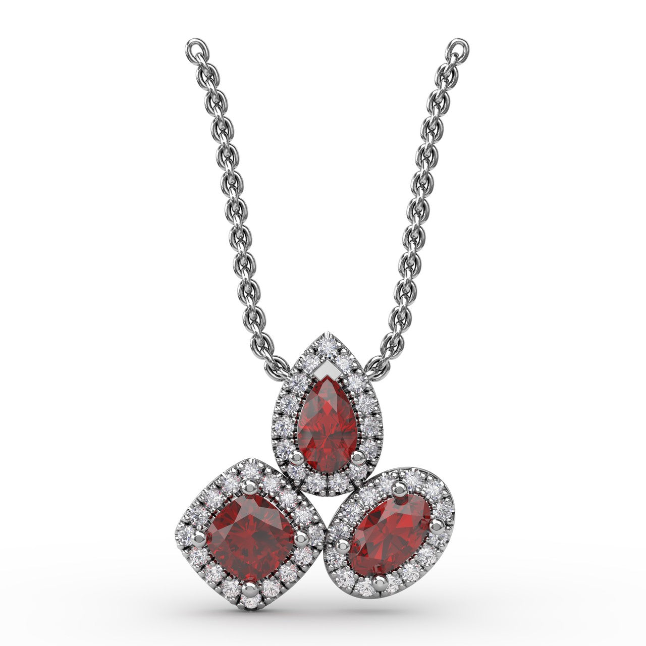 An abstract collection of three precious rubies surrounded by pavé diamonds for the most perfect mix of luxury and elegance. This pendant comes in a variety of material types like 14k white gold, yellow gold, rose gold and can be customized. Fana gemstone pendants are perfect for that special woman in your life.