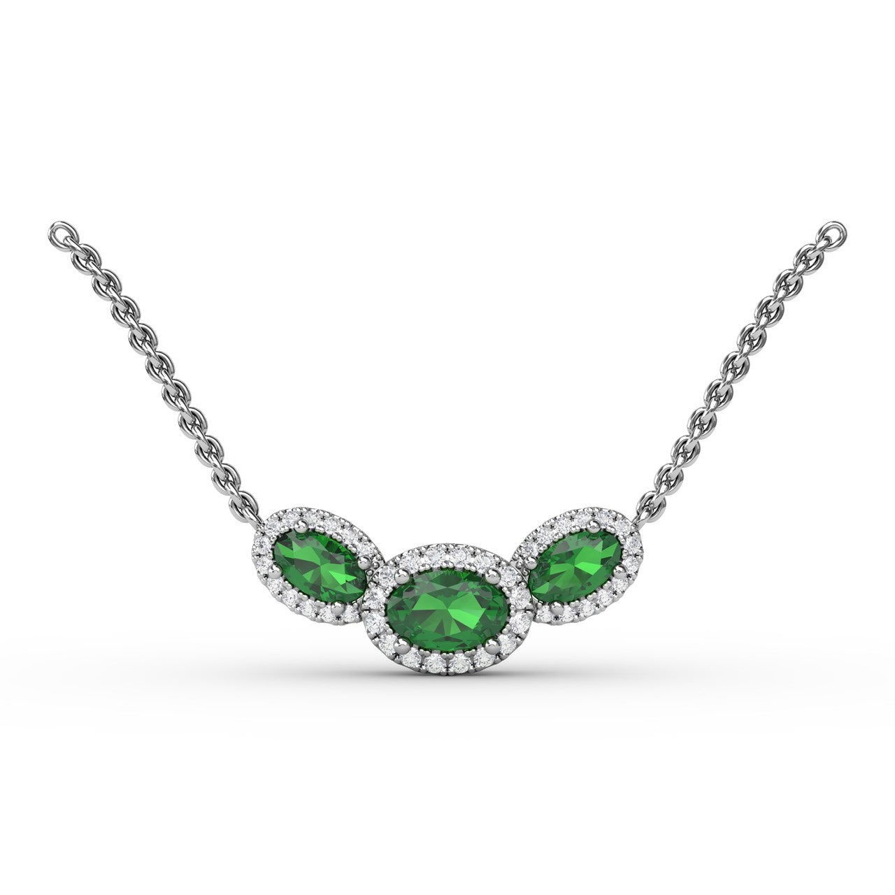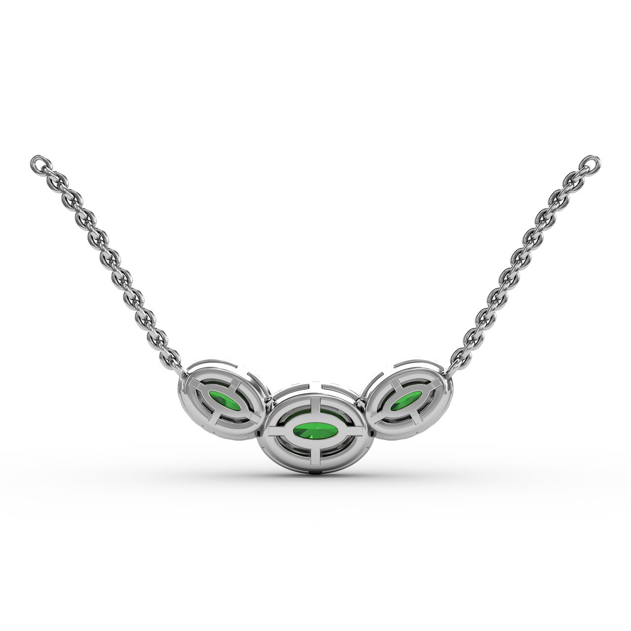 This three stone oval emerald and diamond pendant comes in a variety of material types like 14k white gold, yellow gold, rose gold and can be customized. Fana gemstone pendants are perfect for that special woman in your life
