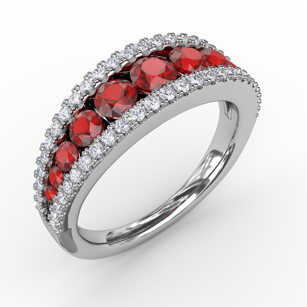 This walk this way ruby and diamond ring comes in a variety of material types like 14k white gold, yellow gold, rose gold and can be customized. Classic Fana gemstone fashion rings are perfect for that special woman in your life.