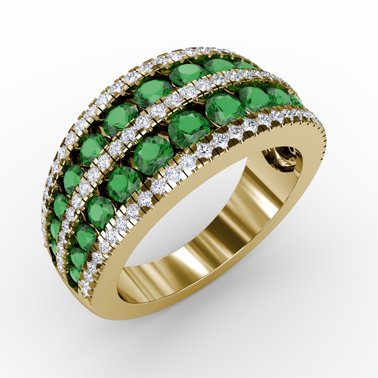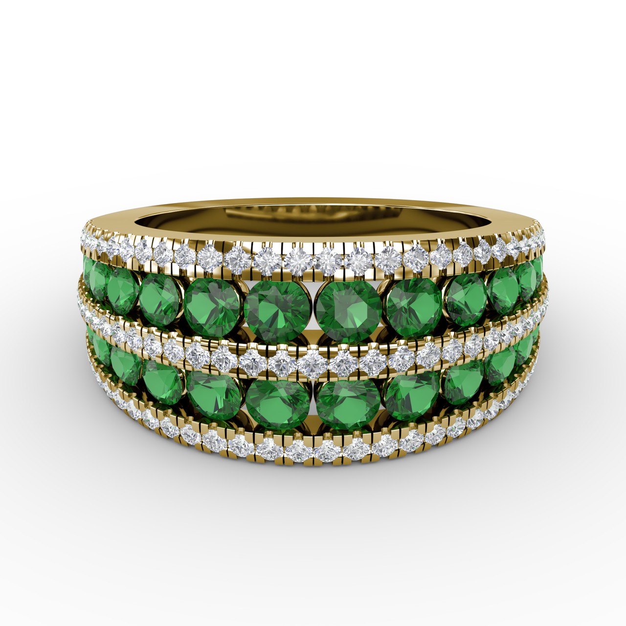 This chasing bliss emerald and diamond stacked row ring comes in a variety of material types like 14k white gold, yellow gold, rose gold and can be customized. Fana gemstone fashion rings are perfect for that special woman in your life.