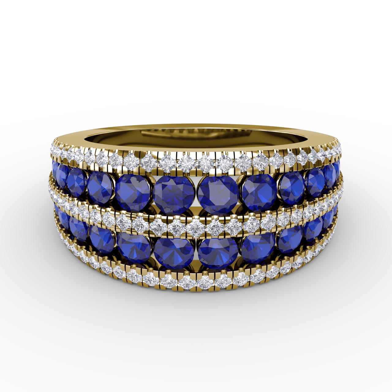 This chasing bliss sapphire and diamond stacked row ring comes in a variety of material types like 14k white gold, yellow gold, rose gold and can be customized. Fana gemstone fashion rings are perfect for that special woman in your life.