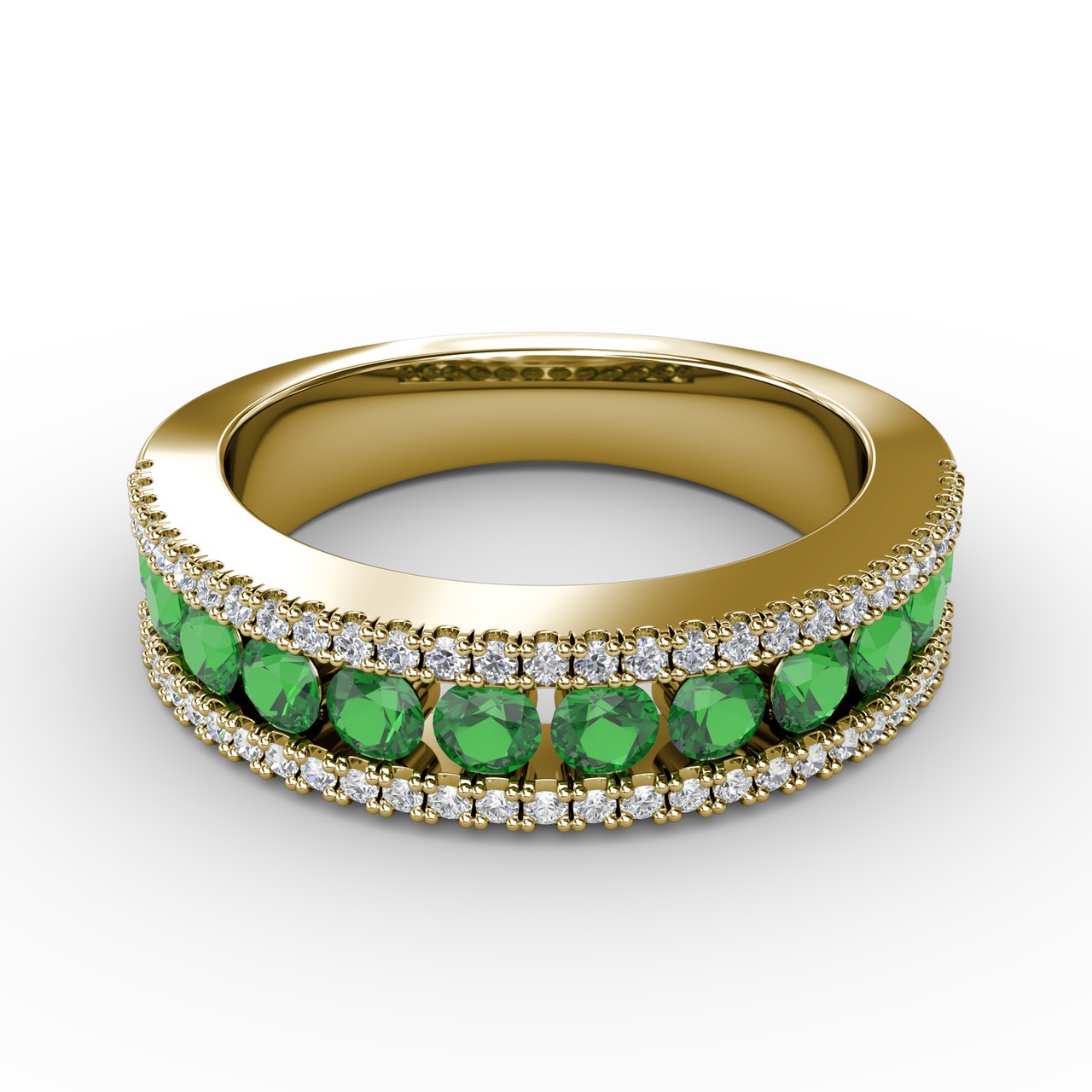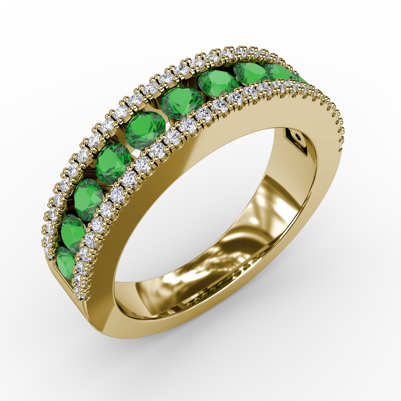 This destined to be emerald and diamond channel setting ring comes in a variety of material types like 14k white gold, yellow gold, rose gold and can be customized. Fana gemstone fashion rings are perfect for that special woman in your life.