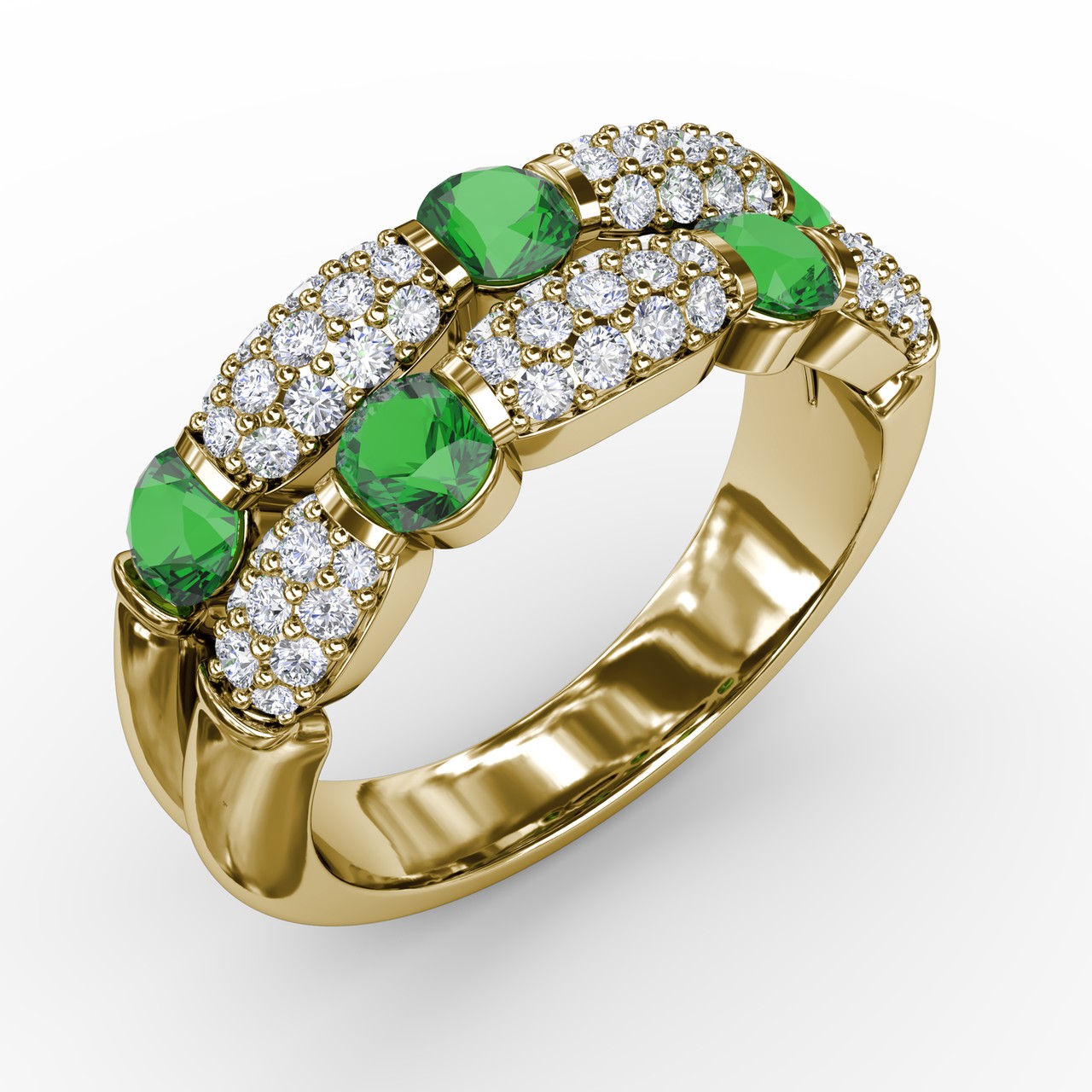 This emerald and diamond double row ring comes in a variety of material types like 14k white gold, yellow gold, rose gold and can be customized. Fana gemstone fashion rings are perfect for that special woman in your life.