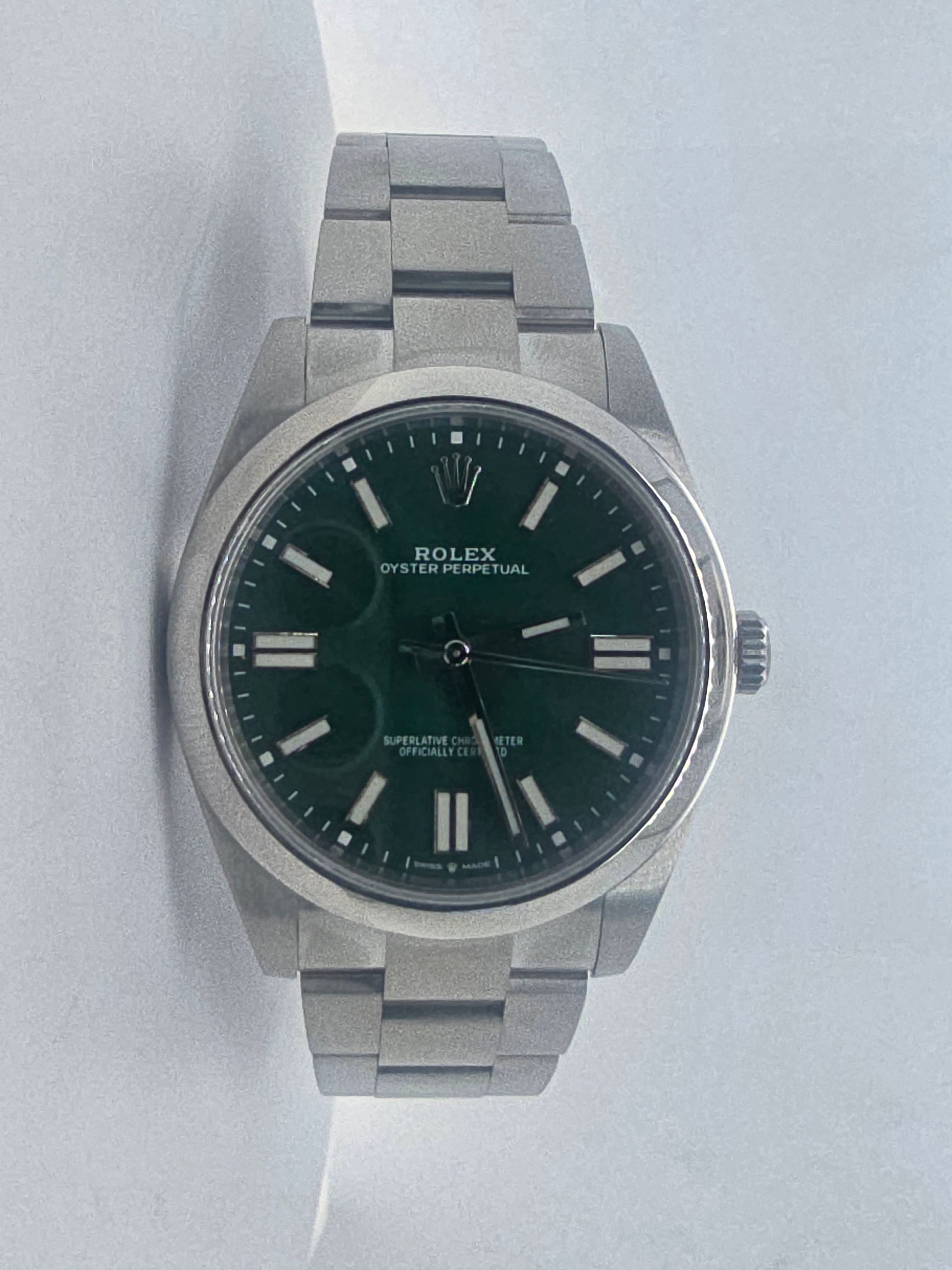 41MM OYSTER PERPETUAL, SS, OYSTER BAND, SMOOTH BEZEL, GREEN DIAL, MODEL # 124300, SERIAL # A28V5444,