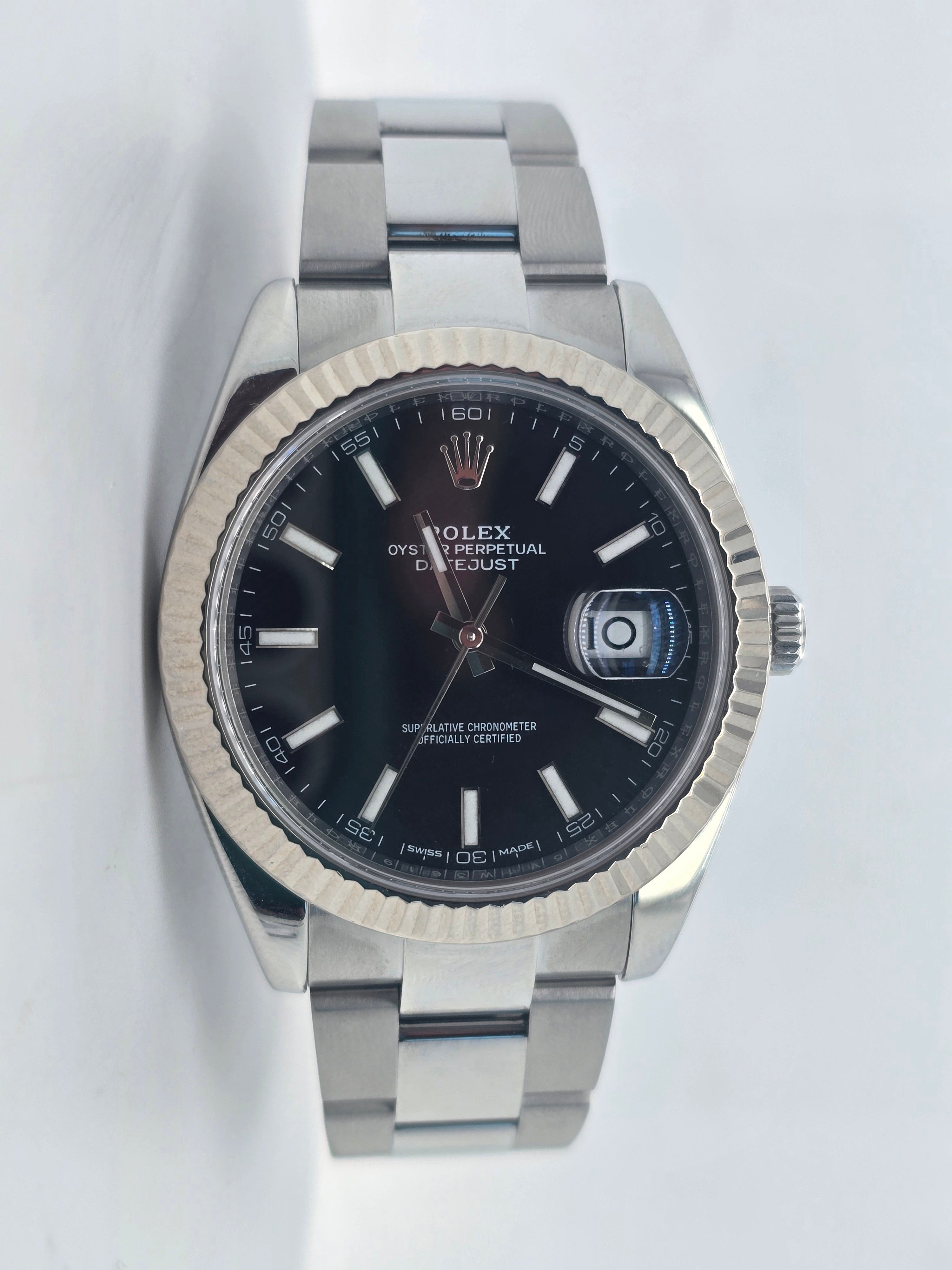 41MM DATEJUST, SS, BLACK STICK DIAL, 18WG FLUTED BEZEL, OYSTER BAND, MODEL # 126334, SERIAL # 5V1W36