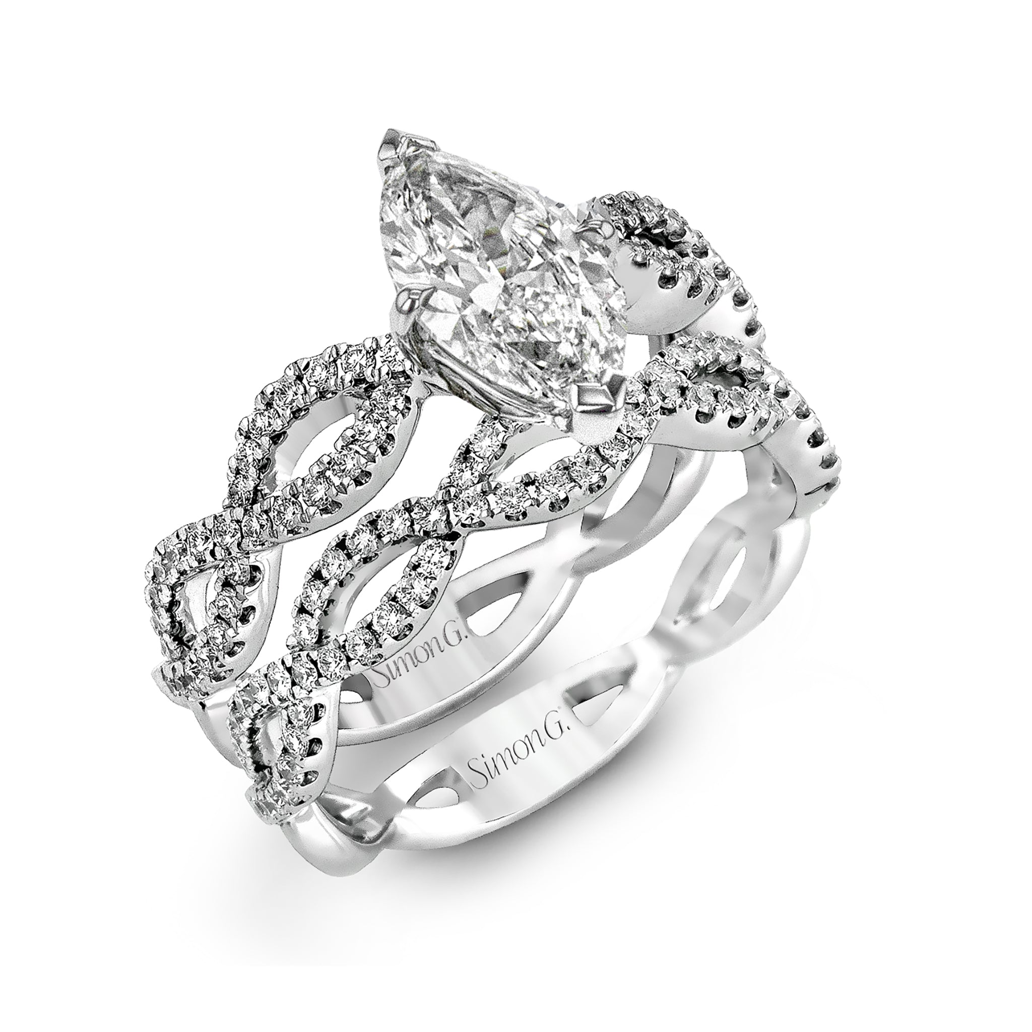 The intricate twist design of this modern wedding set features is adorned with striking white diamonds.
