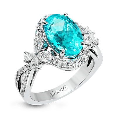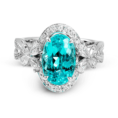 This Ring is Truly Extraordinary, Centering Around an Incredibly Bright 4.04 ctw Paraiba Tourmaline. this is Surrounded by 0.31 ctw of Round Diamonds and 0.66 ctw of Pear Shaped Diamonds Set Into Nature Inspired Elements Crafted in 18k White Gold.