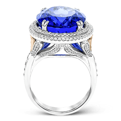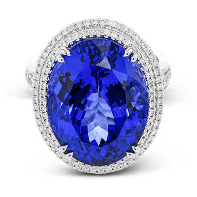 This Right Hand Ring Makes a Statement with a Stunning Faceted Tanzanite Center 20.44 ctw., Held in Place with Double Claw Prongs, and has a Double Halo of White Diamonds 1.05 Ctw. the White Gold Setting has Rose Gold Accents.