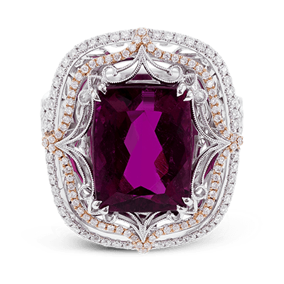 This Vintage-Inspired Two-Tone 18k Gold Ring Centers on an Extraordinary 7.03 Rubellite Stone Which is Surrounded by 0.67 ctw of White Diamonds.