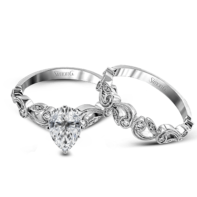 This delicate, floral-inspired wedding set is accentuated with shimmering white diamonds.