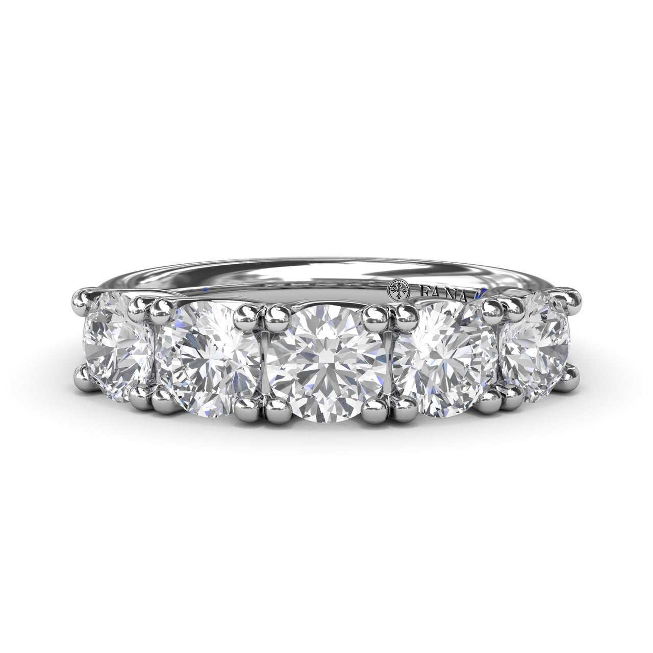 This diamond anniversary band showcases five bold round diamonds, elegantly set in a classic trellis design. This band can be special ordered in any finger size, in Platinum, 18KT, or 14KT gold.