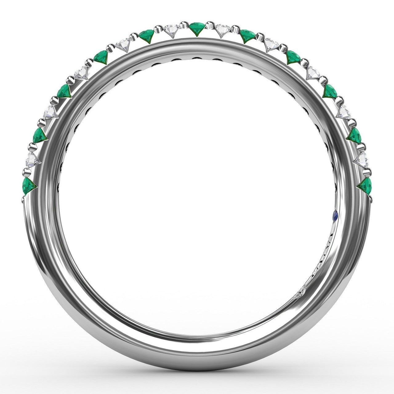 Our petite shared prong anniversary band offers a modern aesthetic with a series of deep cut v's in the profile to allow the brilliance of each hand set diamond and emerald to be on full display. This anniversary band can be special ordered in any finger size, in Platinum, 18KT & 14KT gold and can be customized for any shape and size centerstone.