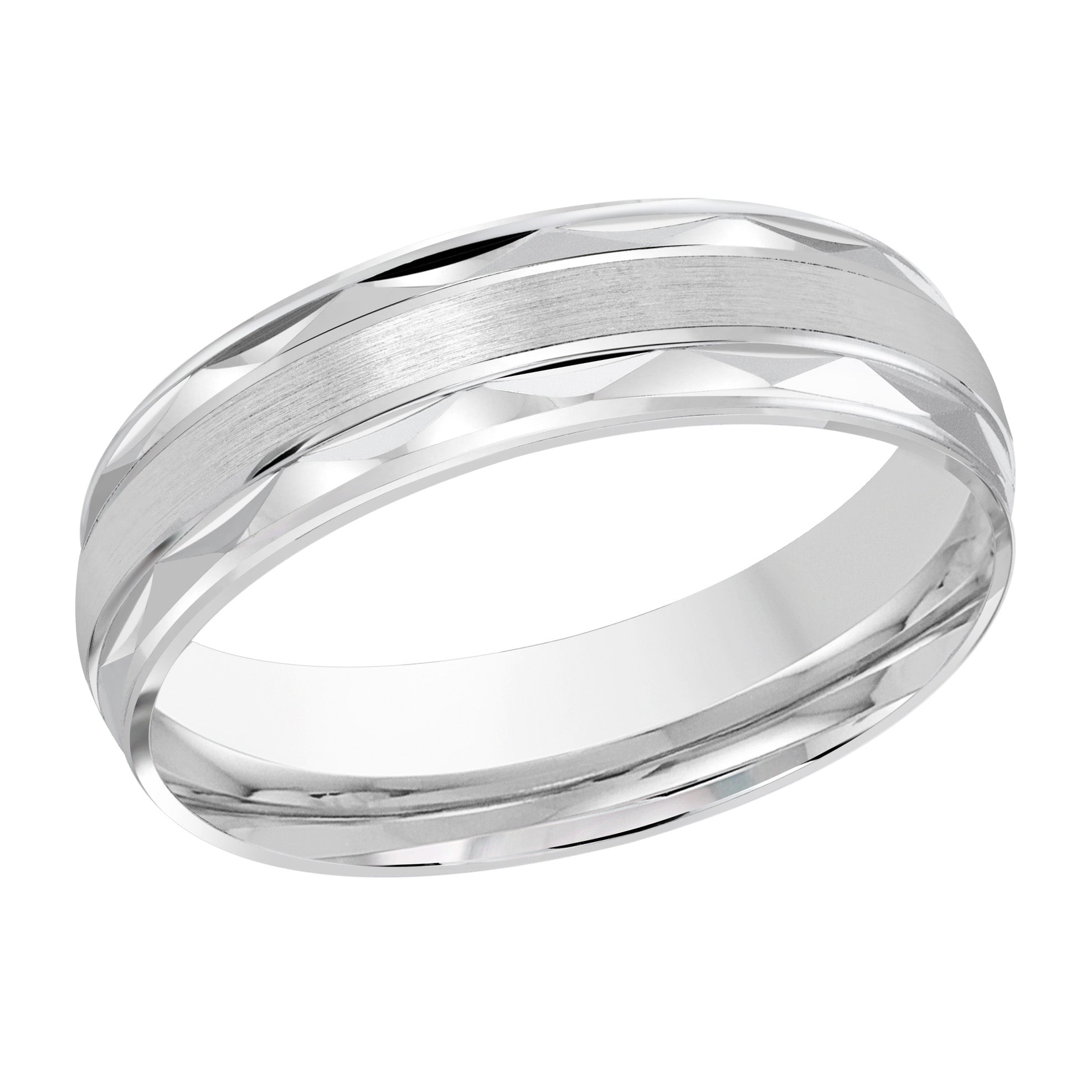 This 6mm white gold wedding ring has a satin center embellished with high polish grooves and striking high polish triangual cuts along the edges.