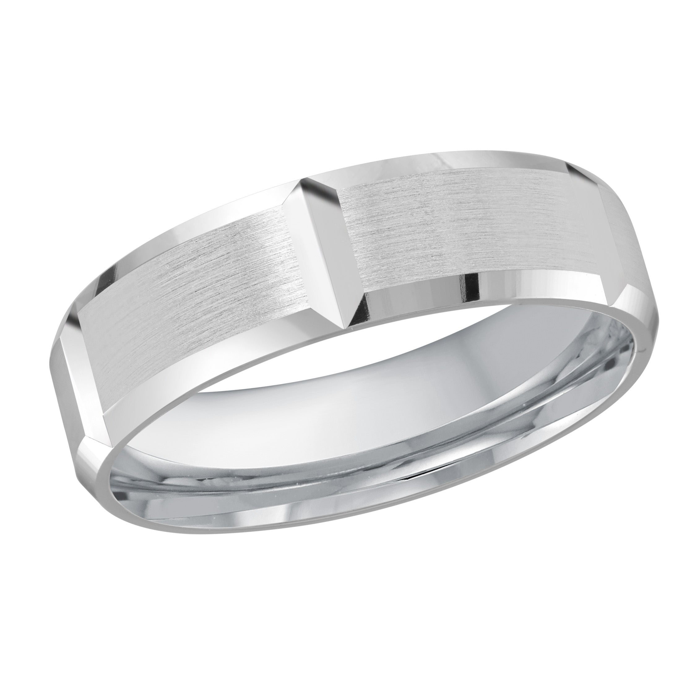 This 6mm white gold wedding ring with a satin finish features multiple striking high polish V shaped cuts and is finished off with slanted high polish edges.
