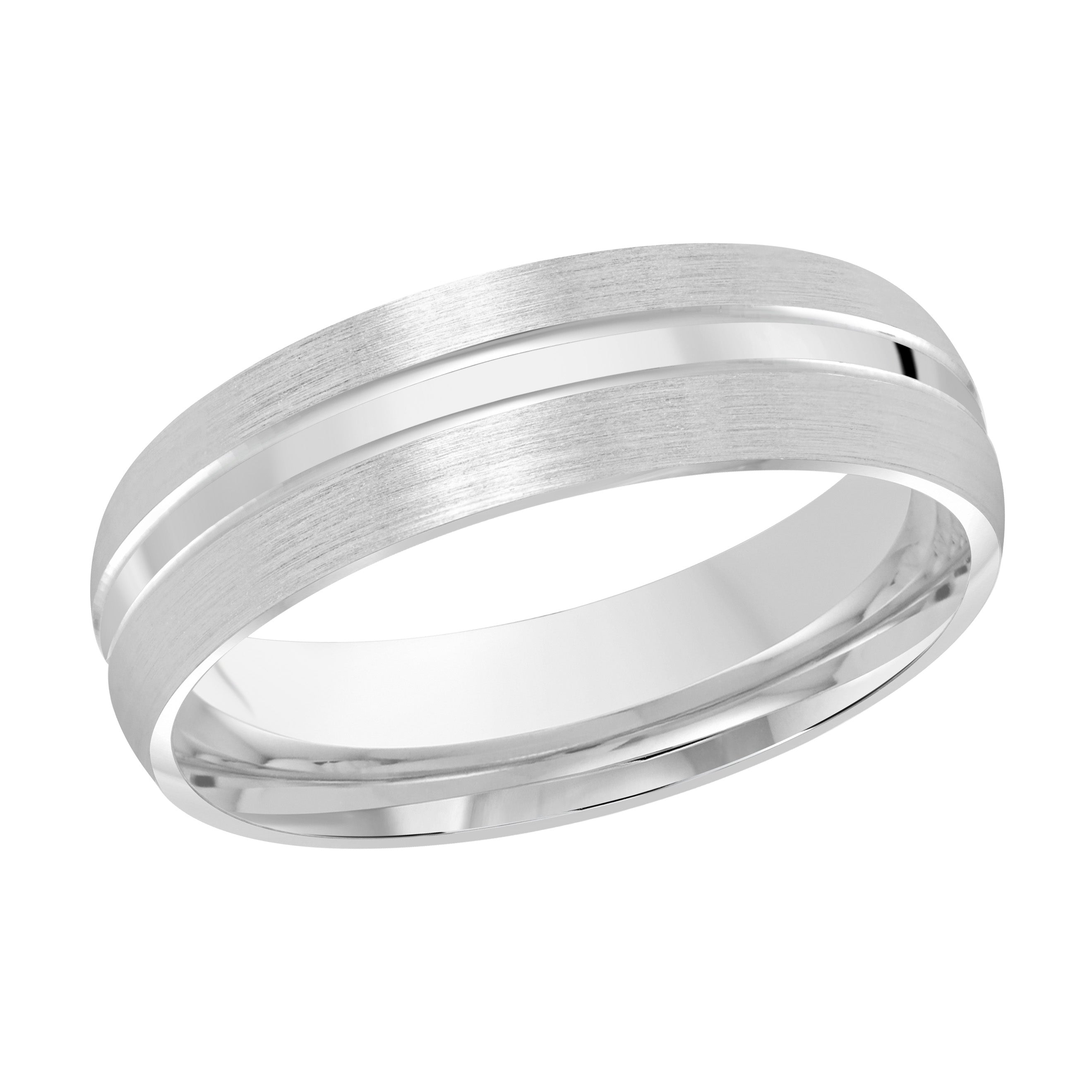 This 6mm white gold domed wedding ring has a satin finish with a thick high polish groove along the center.