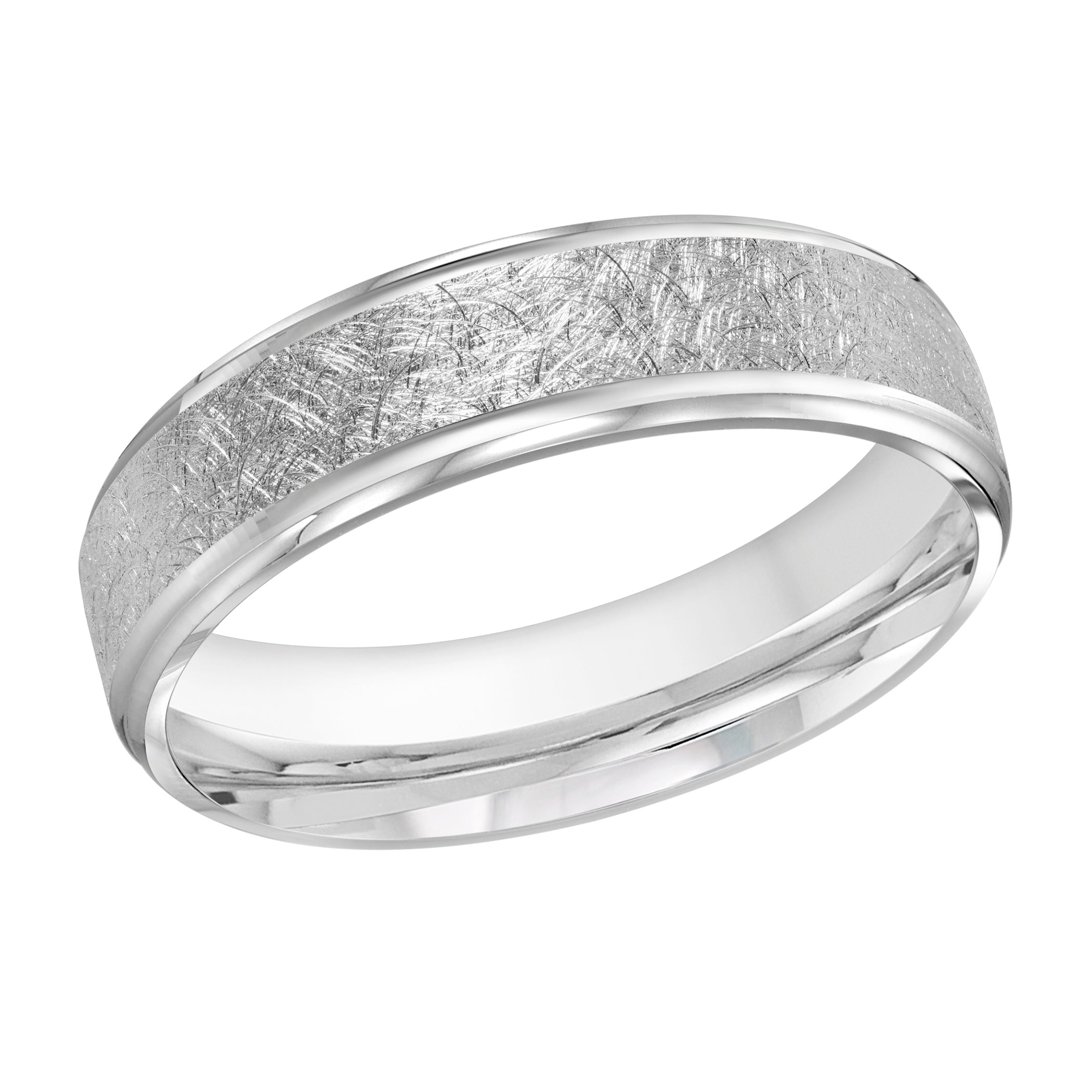 This elegant 6mm white gold wedding ring has a scratch center with a high polish double grooved edges.
