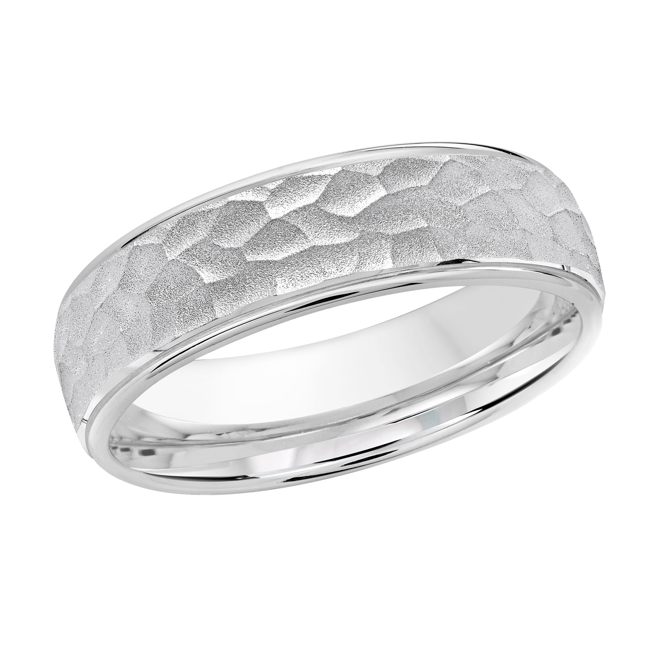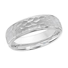 This 6mm white gold wedding ring has a domed center with a stunning hammered finish and high polish edges.