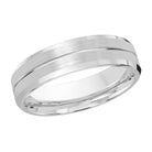 This elegant 6mm white gold wedding ring features a high polish groove along its satin center and is finished off with slanted high polish edges.