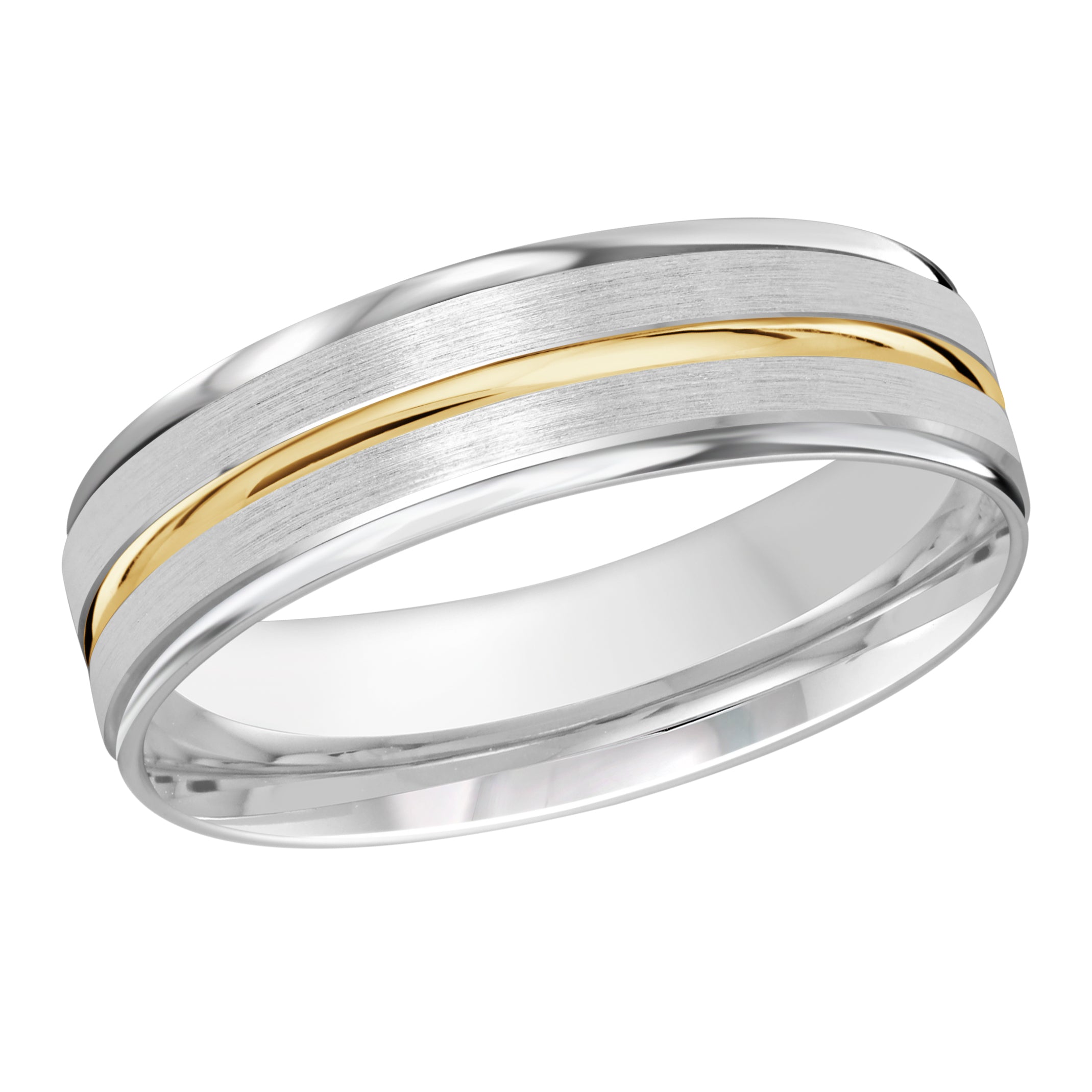 This 6mm white gold wedding ring with a satin finish features a yellow gold high polish groove along its center and a high polish grooved edges.
