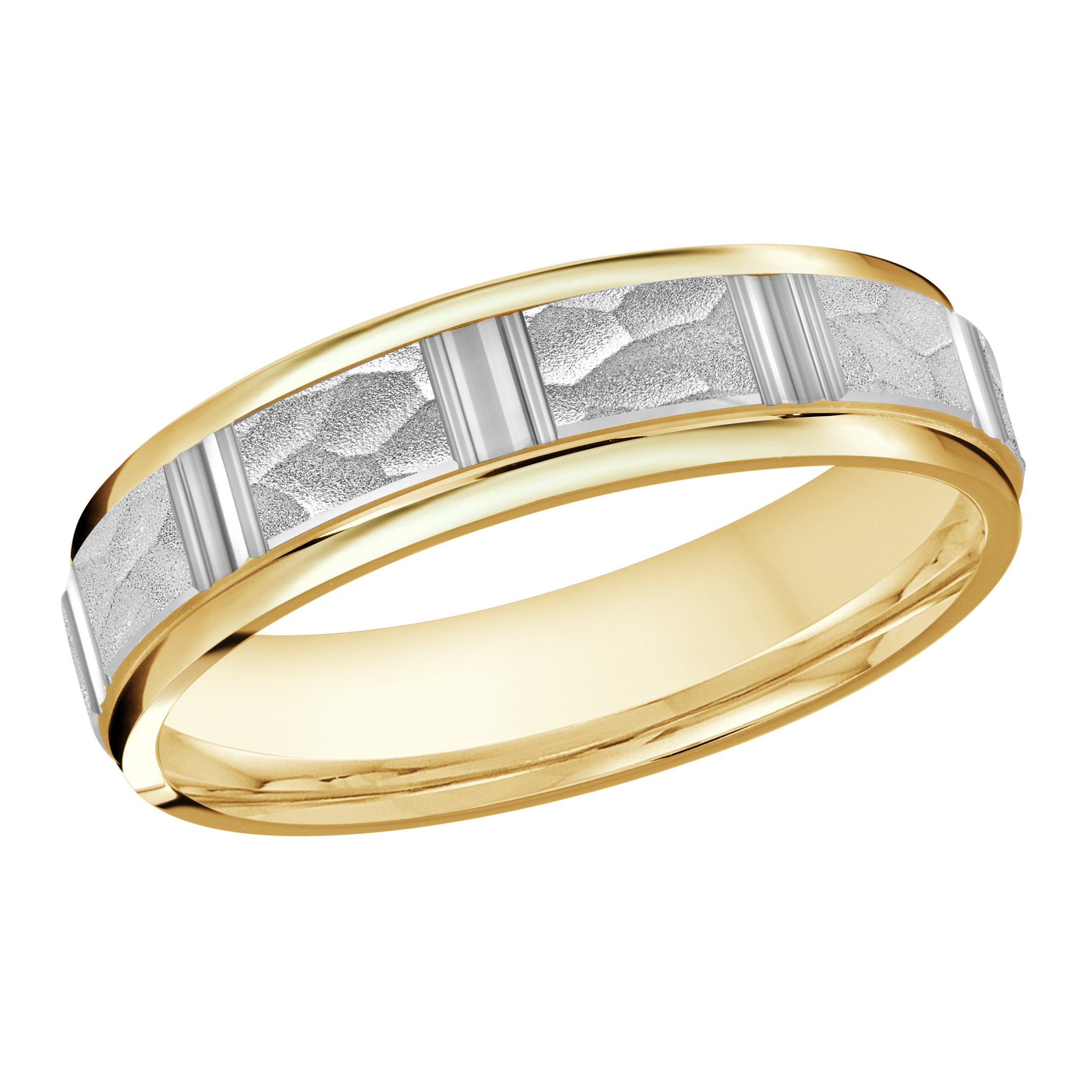 This elegant 6mm two-tone wedding ring features an elevated white gold hammered center with multiple high polish rectangular carved motifs all around its surface and is finished off with yellow gold high polish edges.