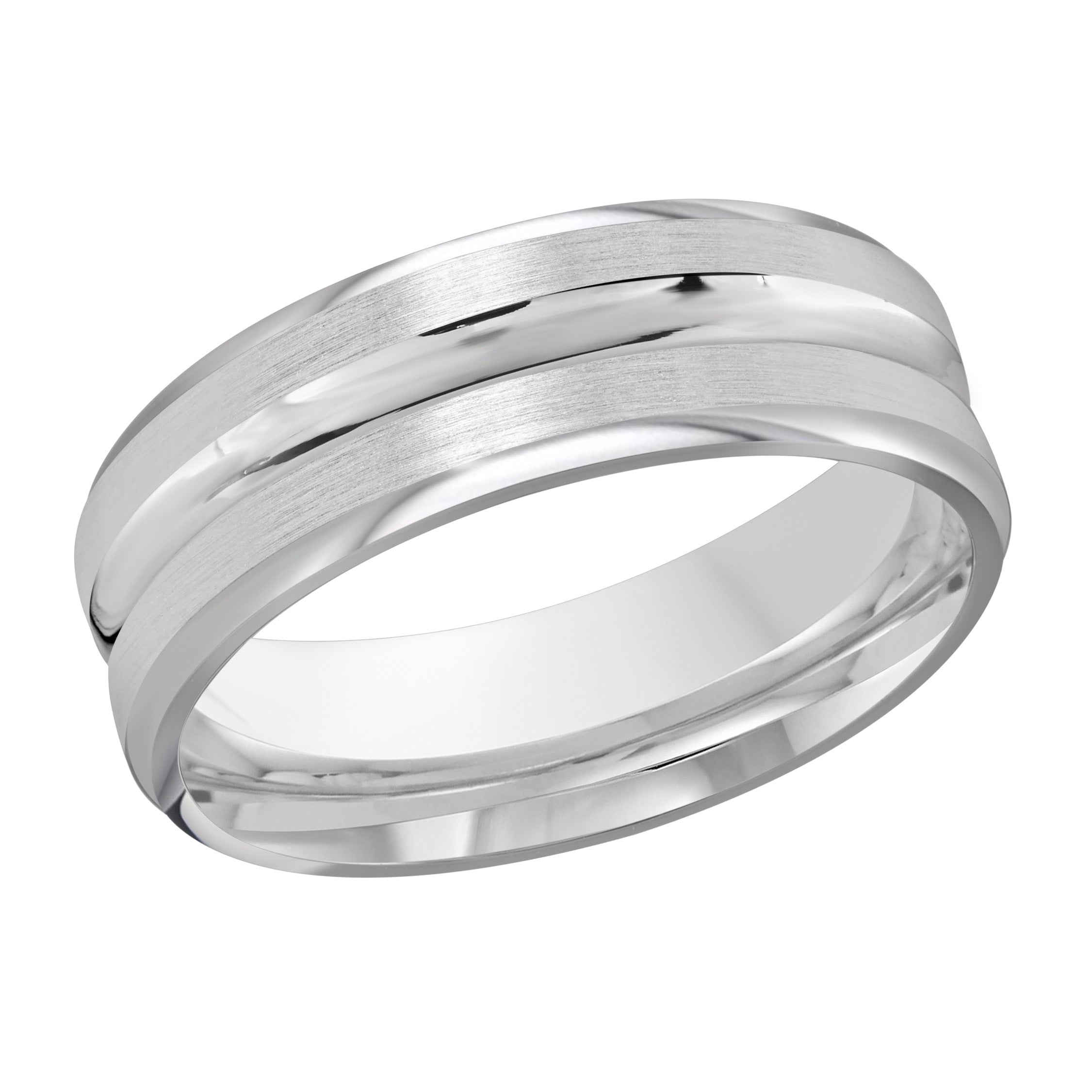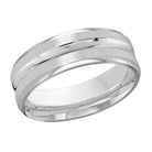 This elegant 7mm white gold wedding ring features a satin center surrounded by high polish grooves and edges.