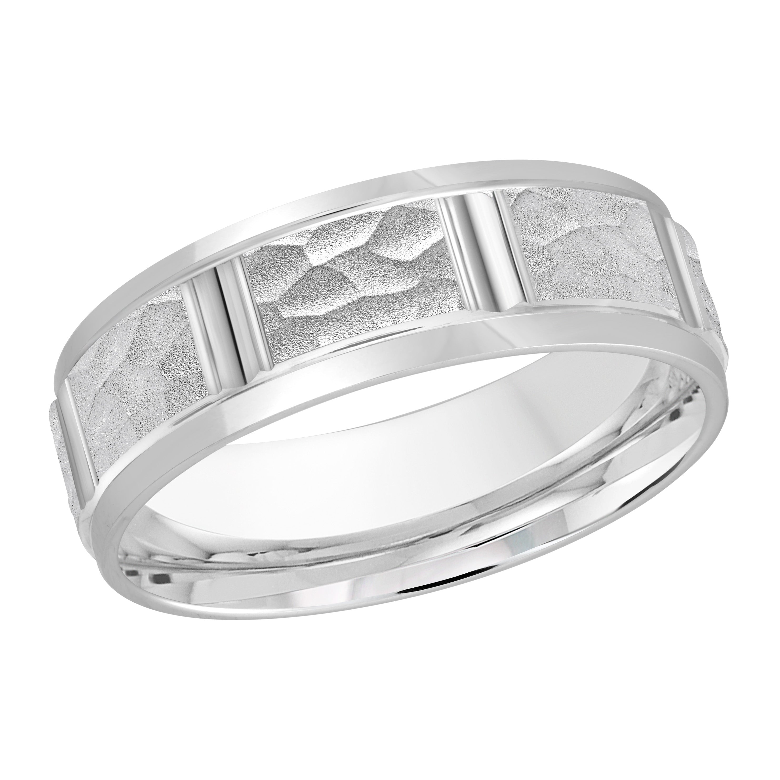 This 7mm white gold wedding ring features multiple high polish rectangular carved motifs all along its hammered center and is finished off with flat high polish edges.