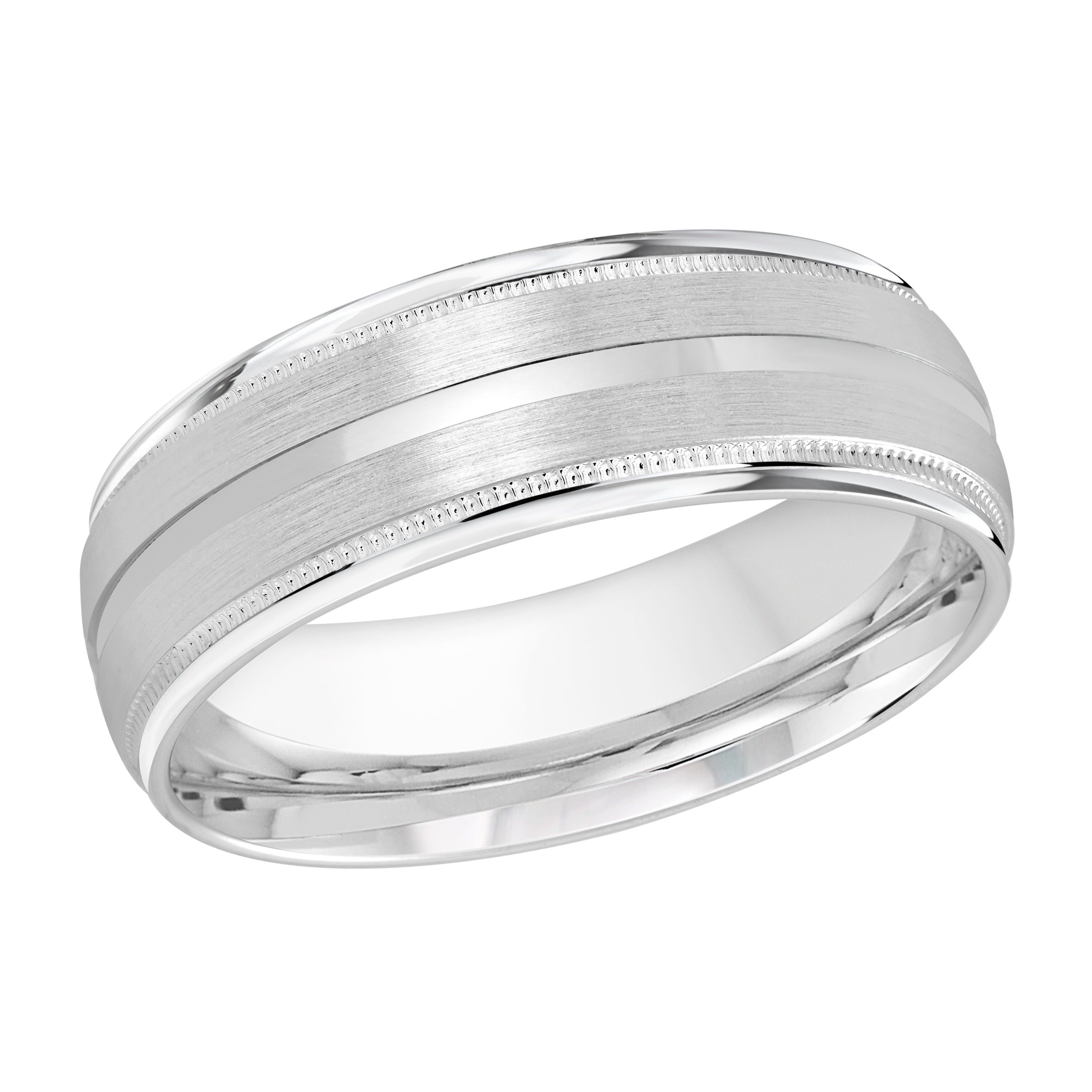 This 7mm white gold wedding ring with a satin finish has a high polish groove along the center embellished with milgrain and high polish edges.