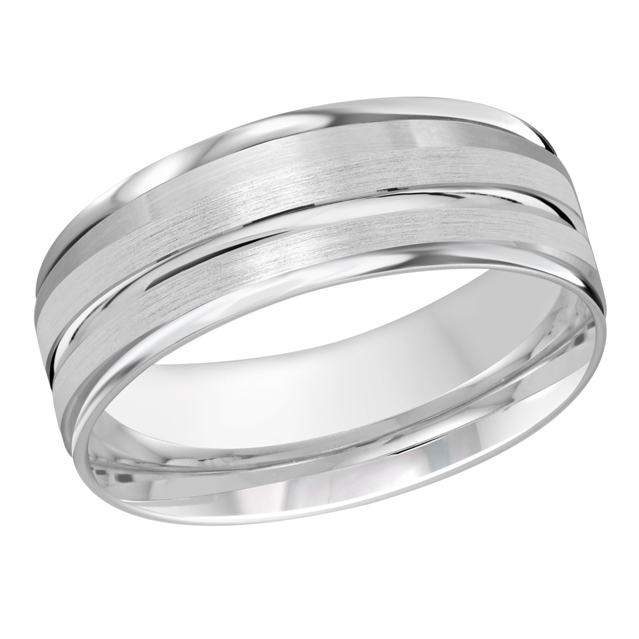 This 8mm white gold wedding ring with a stunning satin finish features a high polish groove along the center and at the edges.