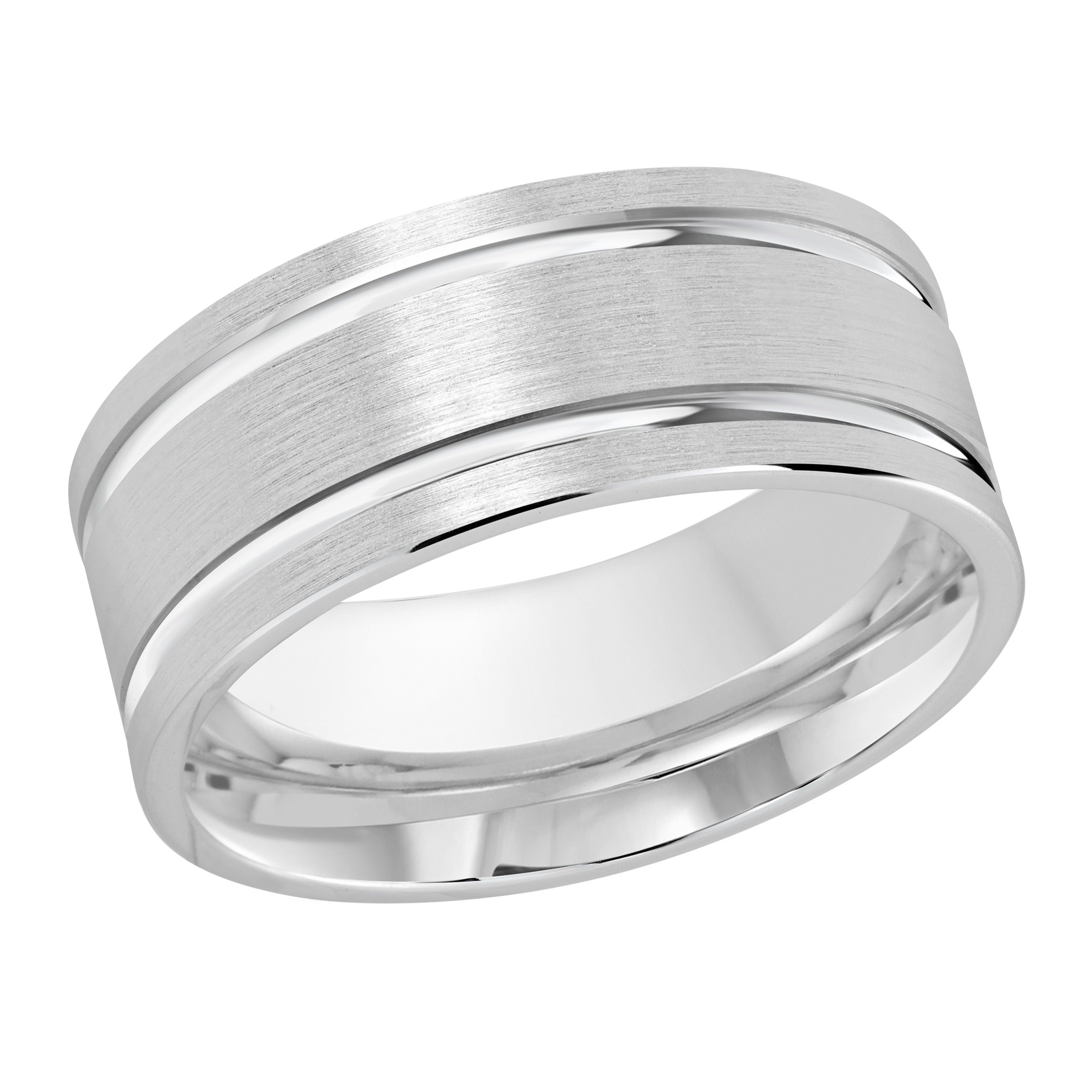 This classic 8mm white gold flat wedding ring with a satin finish features two parallel high polish grooves along its surface.