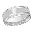 This elegant 8mm white gold wedding ring features a satin center embellished with milgrain and is finished off with high polish grooved edges.