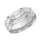 This 8mm white gold wedding ring features an exquisite diamond cut carving along its satin center. The center of the ring is embellished with milgrain and the ring is finished off with a double grooved high polish edges.