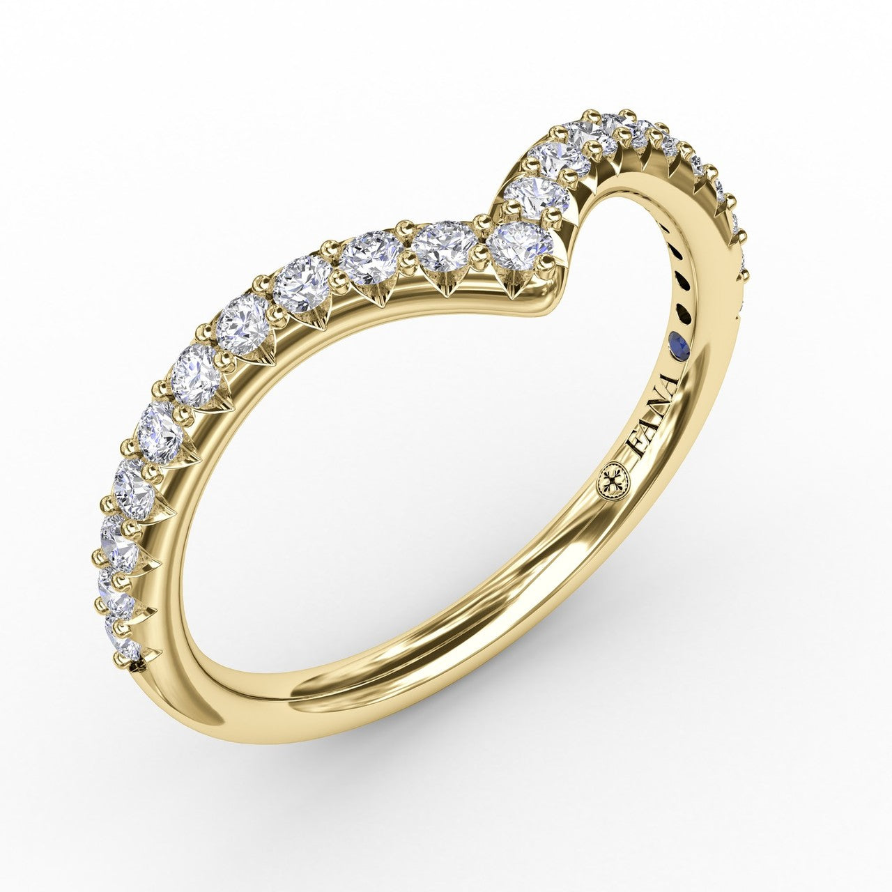 This elegant and delicately curved chevron diamond band is the perfect accent to your engagement ring. Perfect for stacking, this band can be special ordered in any finger size, in Platinum, 18KT & 14KT gold and can be customized for any shape and size centerstone.