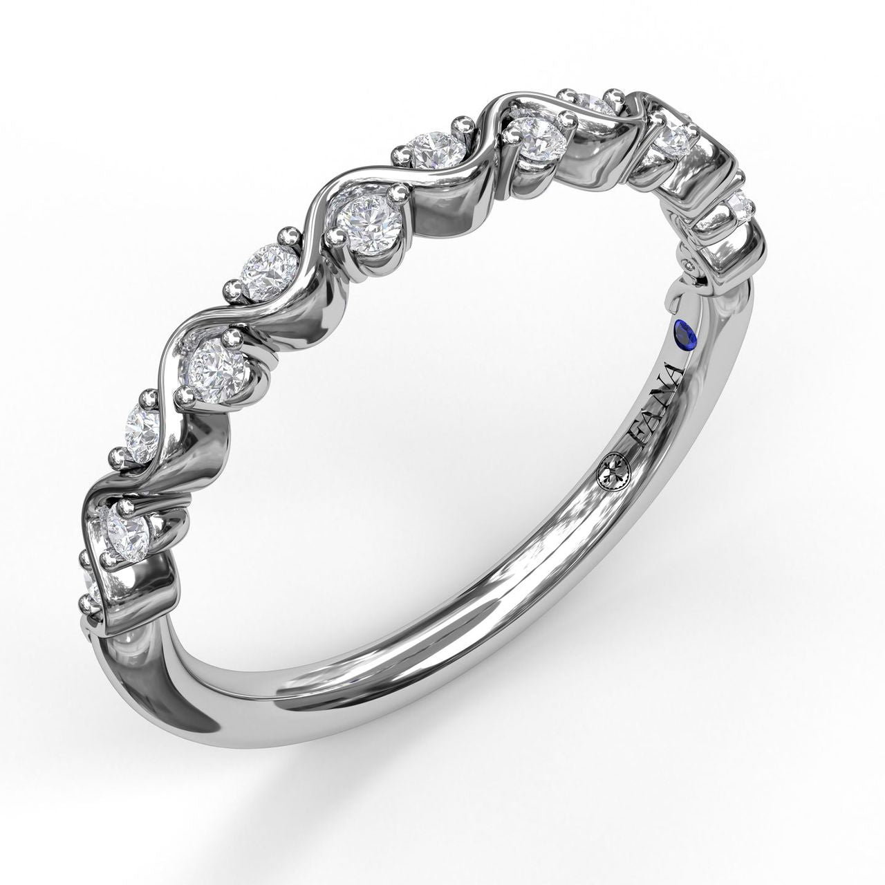 A rippling band of gold gently cradles a series of round brilliant diamonds in this exquisite diamond wedding band. This band can be special ordered in any finger size, in Platinum, 18KT & 14KT gold and can be customized for any shape and size centerstone.