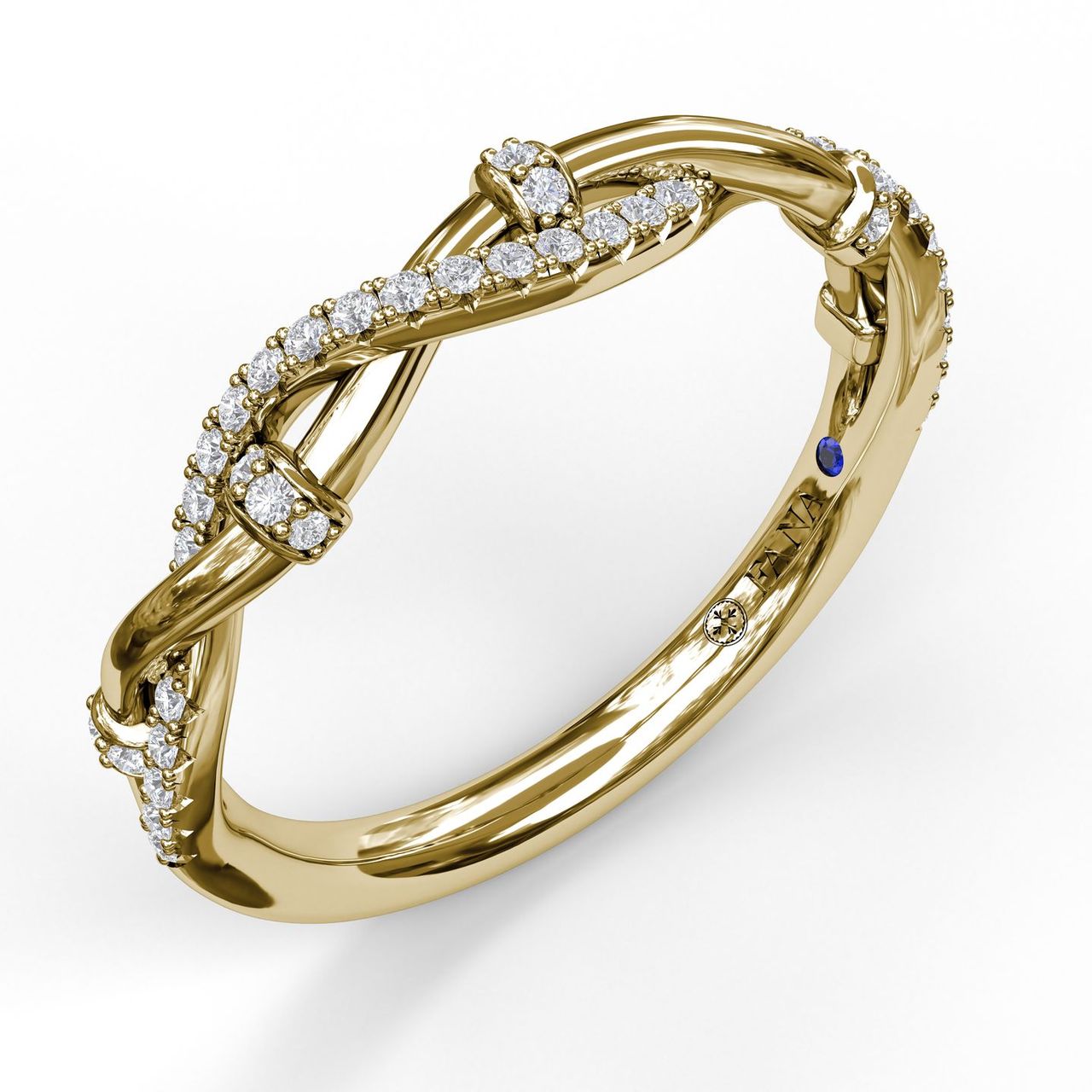 Shimmering strands of diamonds and polished gold are woven together in this contemporary diamond band. Perfect for stacking, this band can be special ordered in any finger size, in Platinum, 18KT & 14KT gold and can be customized for any shape and size centerstone.