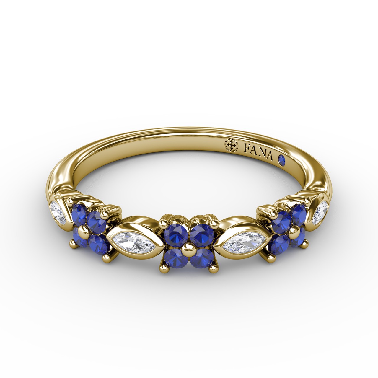 Upgrade your taste with this marquise and round-cut sapphire and diamond floral ring. This ring comes in a variety of material types like 14k white gold, yellow gold, rose gold and can be customized. Classic Fana rings are perfect for that special woman in your life.