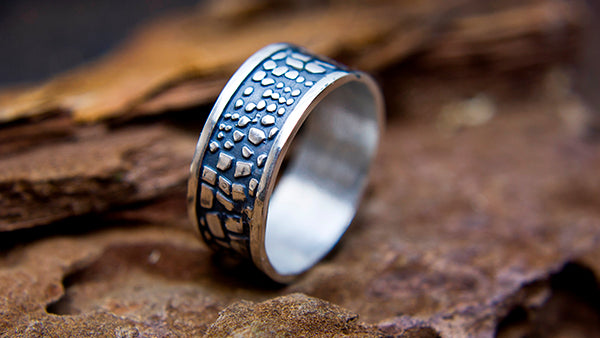 When we think of silver-like wedding band tones, we may also think of darker silver metals like platinum men’s wedding bands. A similar option is titanium men’s wedding bands, a metal that is darker than silver and, like platinum, considered to be very manly and masculine. Just as white gold, these neutral colors come with the added benefit of being able to match many other accessories worn by men - such as bracelets and even timepieces (since most of the latter are made of stainless steel, which work very well together aesthetically).